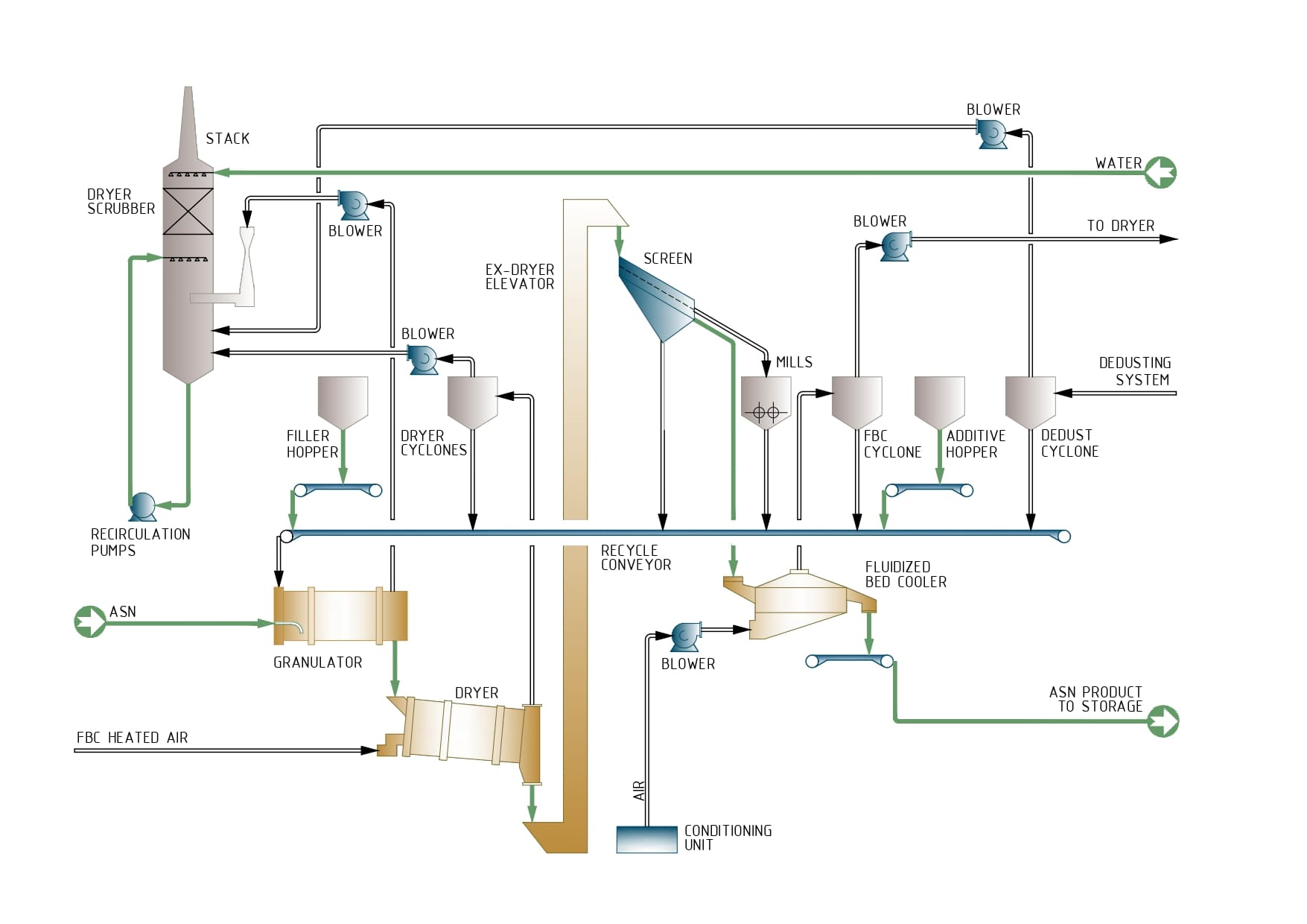 In addition to the CAN granulation process, for ASN Granulation process the same equipment configuration can be utilized to process ammonium sulphate nitrate solution, producing a solid fertilizer